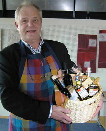 Josef Störmann-Belting (Dipbach) stellte den Bürgermeistern die Regionaltheke als attraktives Instrument der Direktvermarktung für die Landwirte vor. Rund 50 Landwirte aus ganz Franken sind mittlerweile an der Regionaltheke beteiligt, die Produkte werden in mehr als 150 Einzelhandelsgeschäften angeboten. Durch die Direktvermarktung erzielen die Bauern höhere Preise, außerdem werden die natürlichen Ressourcen durch kurze Wege geschont, betonte Störmann-Belting. Für Gemeinden, die Geschenke zu Jubiläen etc. brauchen, bietet sich der Präsentkorb mit Produkten der Regionaltheke von Wurst bis Honig und Wein an, warb Störmann-Belting. (siehe Bild)