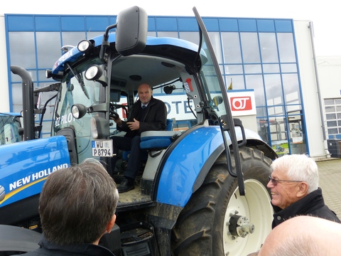Im Rahmen seiner regelmäßigen Firmenbesuche erlebte Landrat Eberhard Nuß bei der OTEMA GmbH in Unterpleichfeld nicht nur interessante Einblicke in die Firmengeschichte und –gegenwart, sondern auch die Faszination der ackertauglichen Fahrzeugriesen. Denn der Landmaschinen- und LKW-Händler OTEMA präsentierte dem Landrat samt Delegation einen beeindruckenden Fuhrpark von New Holland-Traktoren und Landmaschinen. Eine Probefahrt rund ums Gewerbegebiet auf einem der PS-starken blaugelben Traktoren ließ sich Landrat Nuß nicht nehmen.