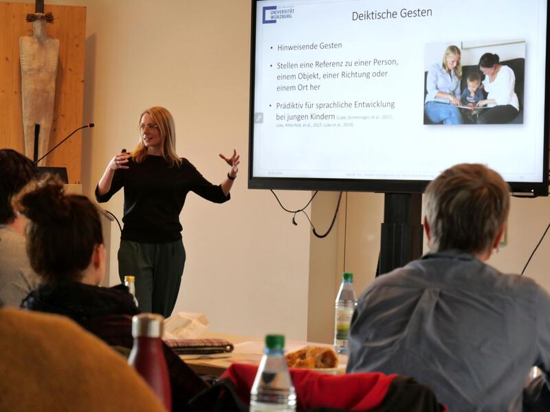 Um Lehrkräfte und Kita-Personal im Umgang mit diesen – aus der Deutschen Gebärdensprache stammenden - Gebärden zu schulen, bot die Arbeitsgemeinschaft Kita-Grundschule von Stadt und Landkreis Würzburg eine Fortbildung an. Die Referentinnen Professorin Dr. Carina Lüke und die wissenschaftliche Mitarbeiterin Nathalie Frey vom Lehrstuhl für Sprachheilpädagogik der Universität Würzburg gingen in ihren Vorträgen unter anderem auf den erwiesenen Nutzen von Gesten und Gebärden im Zuge des Spracherwerbs ein. Kinder mit Schwierigkeiten im Spracherwerb, wie beispielsweise Kinder mit Sprachentwicklungsstörungen, seien demnach statistisch gesehen deutlich stärker gefährdet, im weiteren Lebensverlauf sozial benachteiligt zu sein. Im Umkehrschluss bedeutet dies: Wer Sprache richtig nutzen kann, ist automatisch besser für den weiteren Bildungs- und Lebensweg gerüstet.