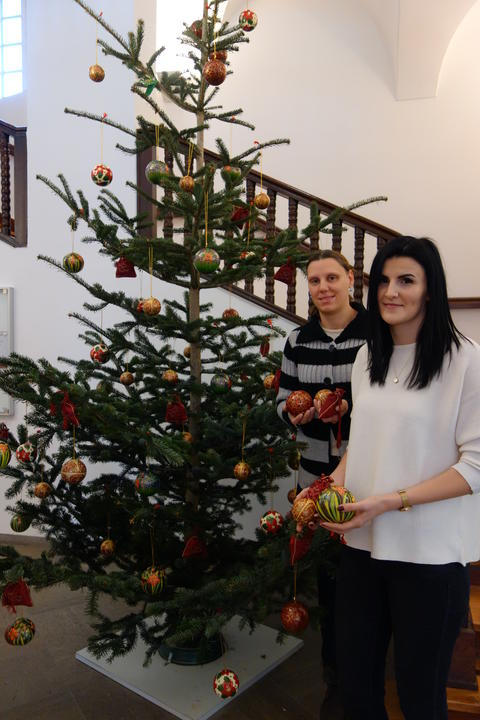 Der Weihnachtsschmuck wurde vom Regionalmanagement beim Fair-Trade-Händler Globo (www.globo-fairtrade.de) angeschafft. Neben bemalten Kugeln aus Pappmachè zieren auch weihnachtlich rote Organza-Säckcken das Schmuckstück in der Eingangshalle des Landratsamtes. Die Kugeln werden im Familienunternehmen Jafar in Kaschmir (Nordindien) hergestellt. Dort arbeiten 25 Personen zwischen 29 und 61 Jahren in der Herstellung von buntbemalten Deko- und Gebrauchsartikeln. Zur Bemalung werden bleifreie Farben auf Wasserbasis verwendet. Werkstattleiter Mukhtar Ahmed hofft, durch den fairen Handel seinen Mitarbeitern und sich selbst ein gutes Auskommen in Nordindien sichern zu können.