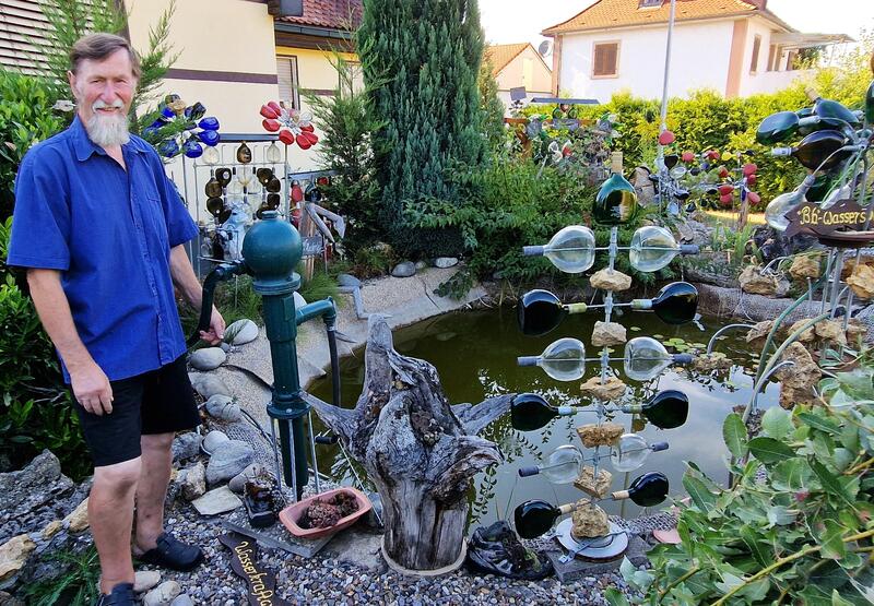 Schon beim Blick über den Gartenzaun fällt dem interessierten Besucher die Besonderheit dieses Gartens ins Auge: Zahlreiche Skulpturen aus fränkischen Bocksbeuteln schmücken das grüne Reich. Von Rankhilfen für die über 100 Rosensorten über Wind- und Wasserspiele bis hin zu einfach nur originellen